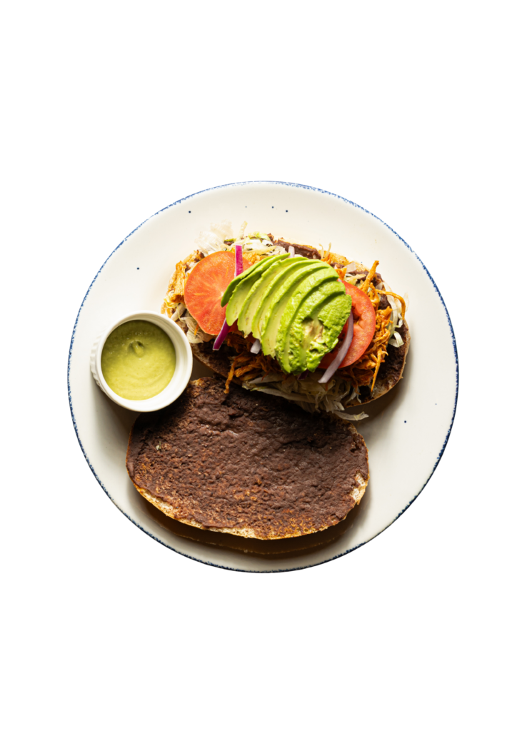 Totopos de maíz, con la salsa de tu elección, coronados con uno de nuestros guisos. Opciones a elegir: